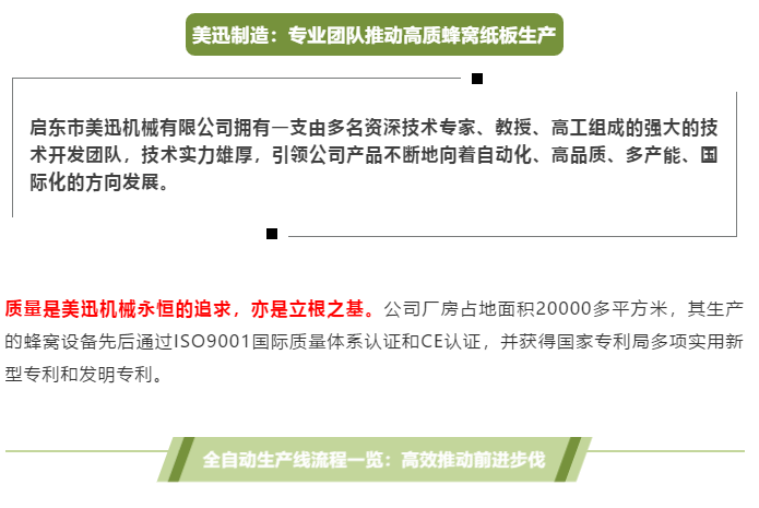在這一方面,啟東市美迅機械有限公司早已深諳其道。作為中國包裝聯(lián)合會成員單位,美迅機械是一家專業(yè)從事蜂窩紙芯、蜂窩紙板成套生產(chǎn)設備研發(fā)、制造、銷售的廠家,也是國內(nèi)較早制造全自動蜂窩紙板連續(xù)生產(chǎn)線的企業(yè)。